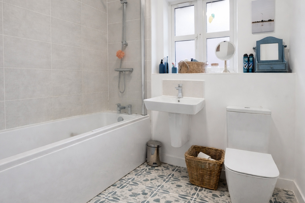 Upstairs the generous double bedroom has space for a double wardrobe and office desk, while the contemporary bathroom includes an over bath shower. A spacious storage cupboard on the landing provides valuable additional space.