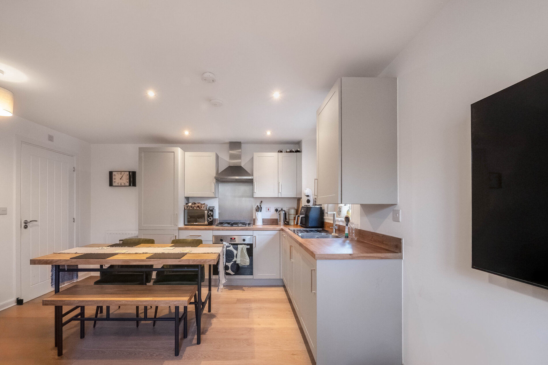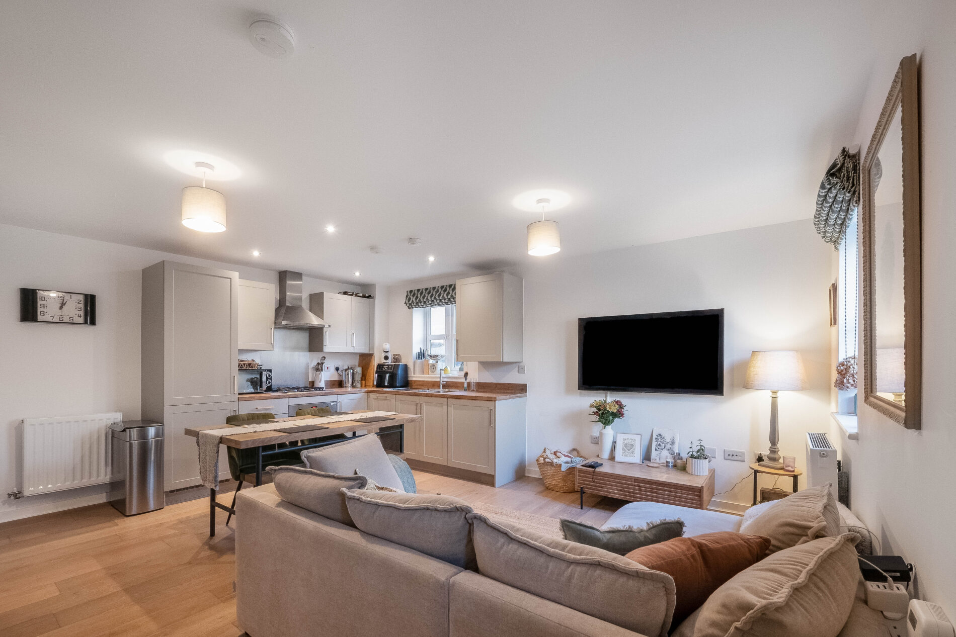 The property opens into a bright, open-plan living, kitchen and dining space, thoughtfully designed with integrated appliances, excellent storage and plenty of room to relax or entertain. A ground floor cloakroom adds every day practicality.