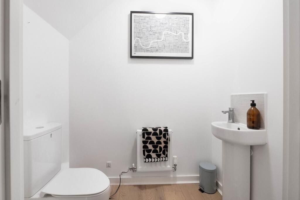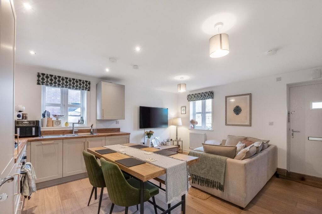 The property opens into a bright, open-plan living, kitchen and dining space, thoughtfully designed with integrated appliances, excellent storage and plenty of room to relax or entertain. A ground floor cloakroom adds every day practicality.
