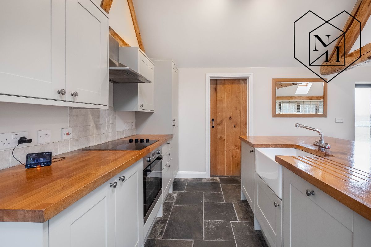 You enter through the oak glass door, which takes you into the open plan Kitchen/dining and living room. The ceiling has the original stunning oak beams from wall to wall. The kitchen is finished with grey units and oak coloured worktop, with oak flooring throughout. It comes with an integrated fridge/freezer, washing machine and character Belfast sink.
