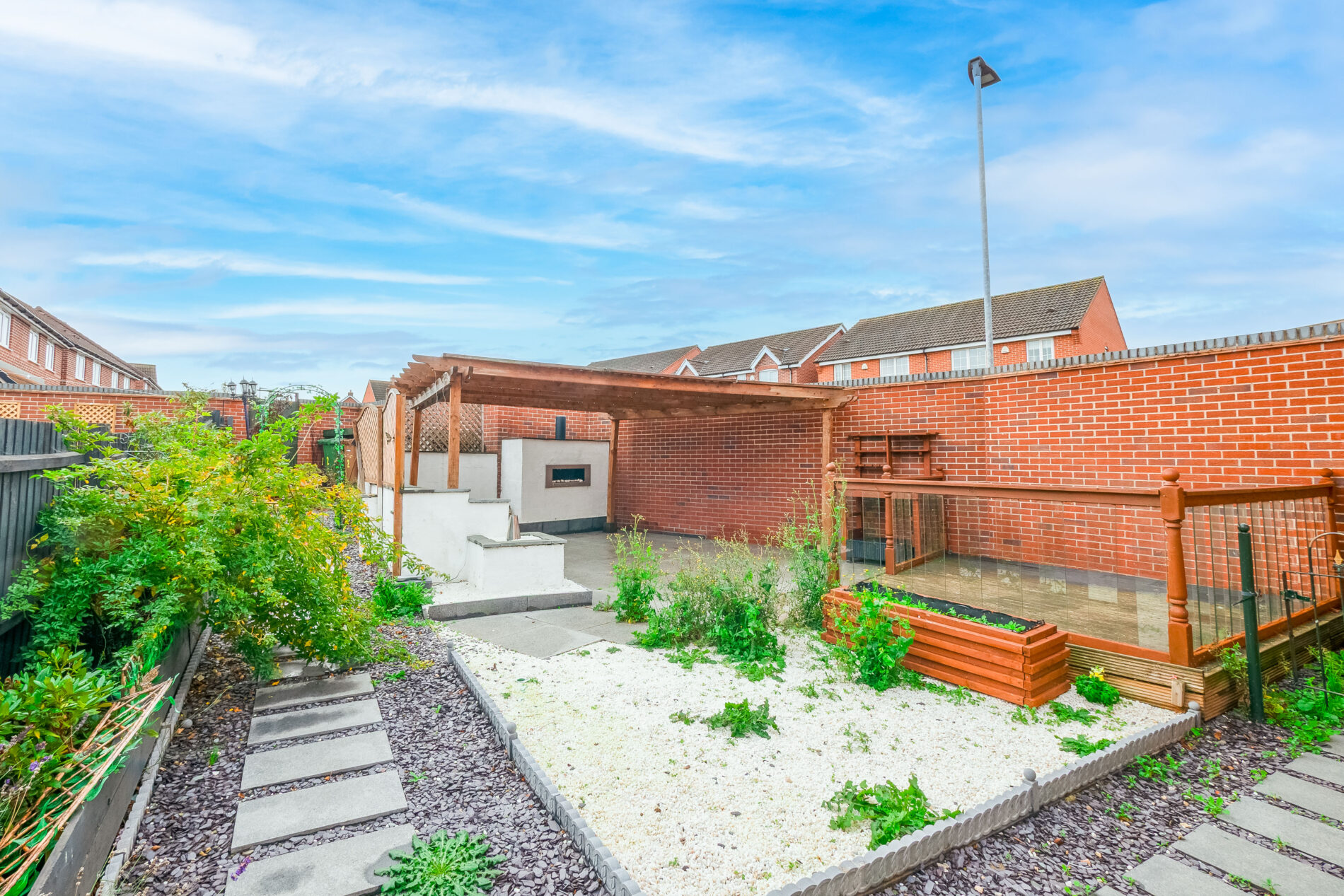 Outside, the rear garden has been thoughtfully landscaped for entertaining, featuring a paved terrace, timber pergola, and decked seating area, an ideal setting for summer barbecues or quiet evening drinks. To the front, low-maintenance gravel and wrought iron fencing add curb appeal, while a tarmac driveway provides off-road parking and leads to a detached garage with power, lighting, and storage.