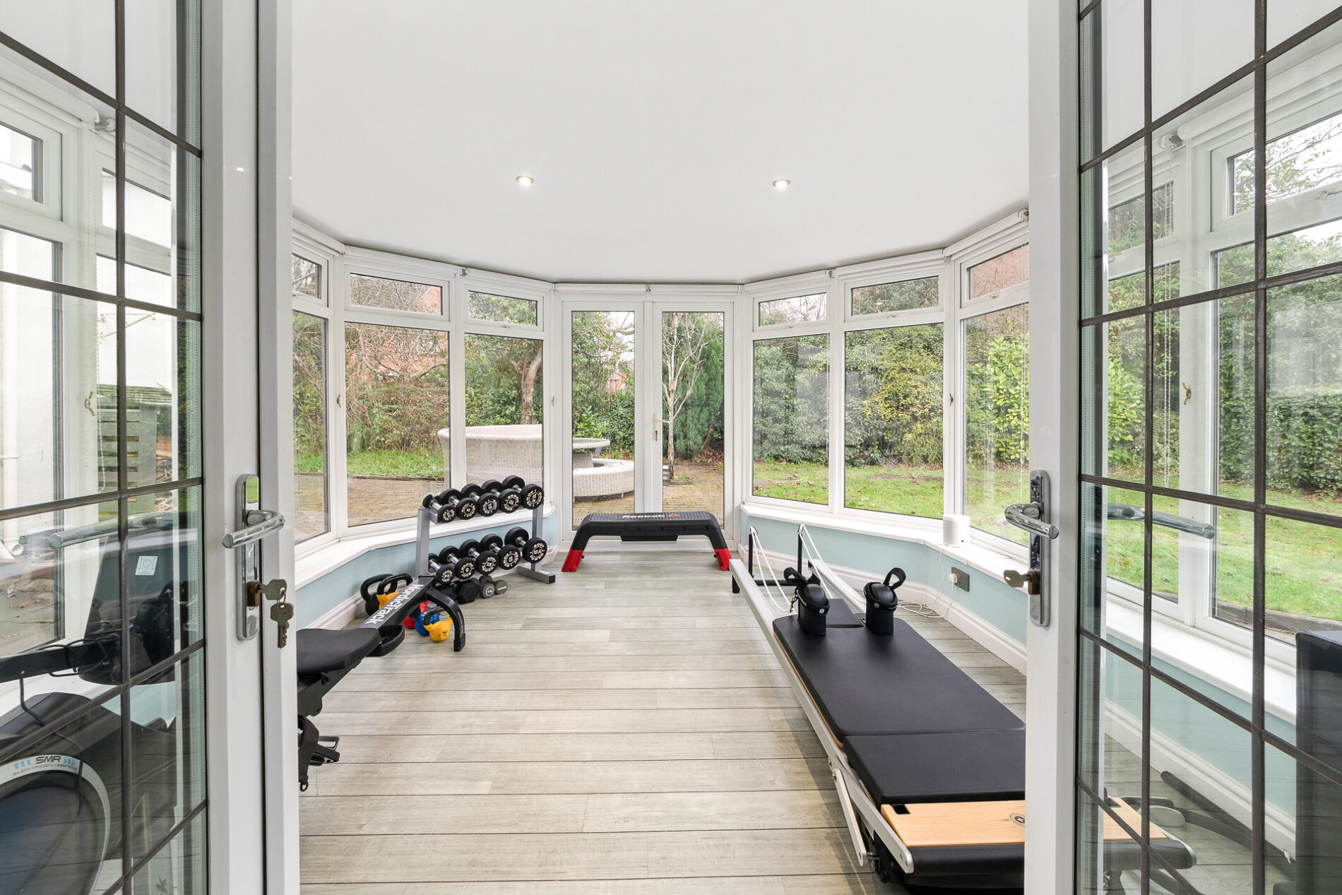 A stunning conservatory that offers a wonderfully light-filled and spacious additional reception area that leads off the kitchen. Currently used as a gym.