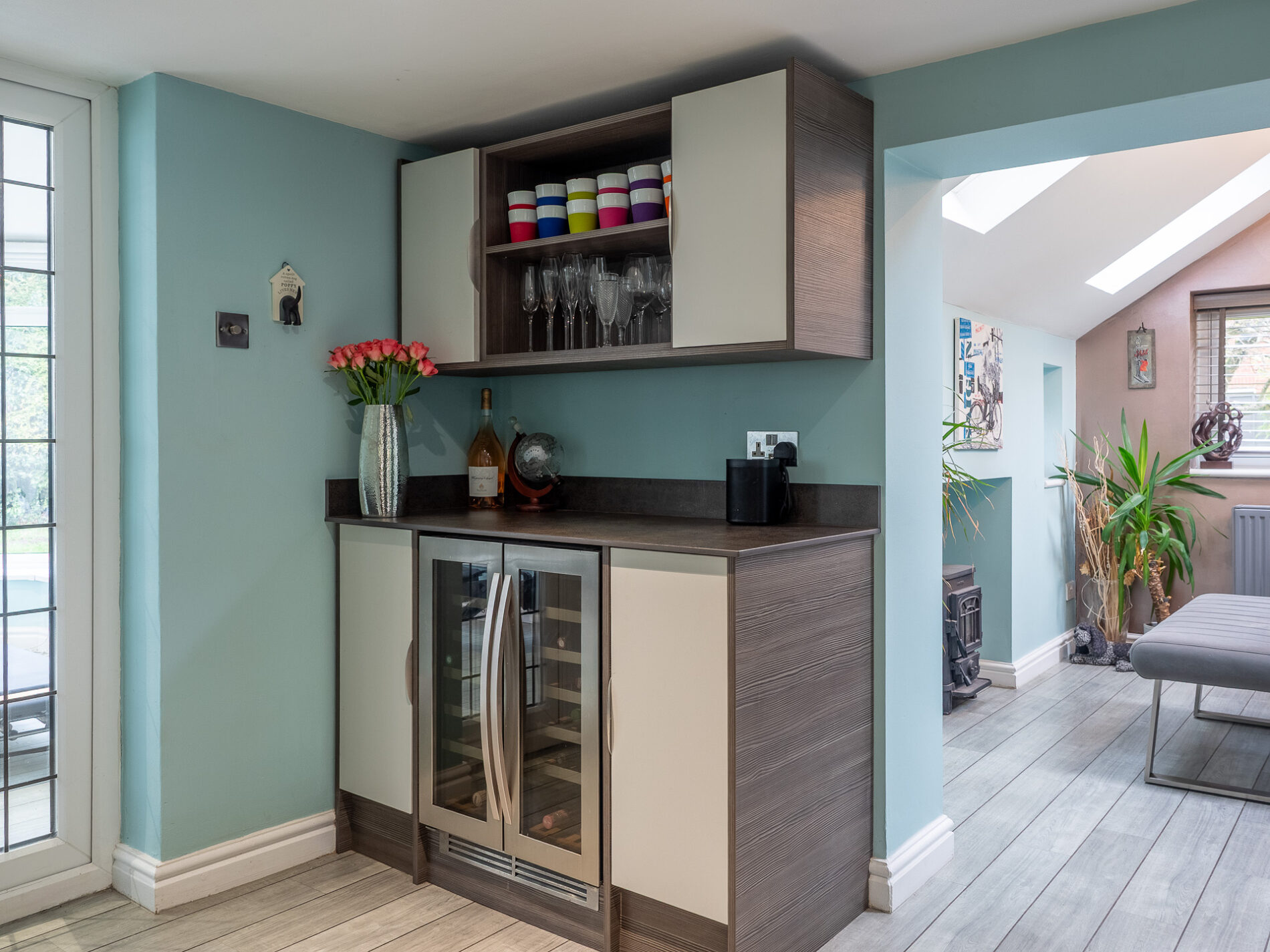 The kitchen is beautifully appointed with an array of built in units and complemented by elegant Neolith work surfaces and built in Neff appliances. The main focal point of this room is the dining/family area enhanced with Velux windows, windows to all aspects and a feature fire creating a warm and cosy ambiance. A handy utility room leads off the kitchen providing more storage and access into the garden.