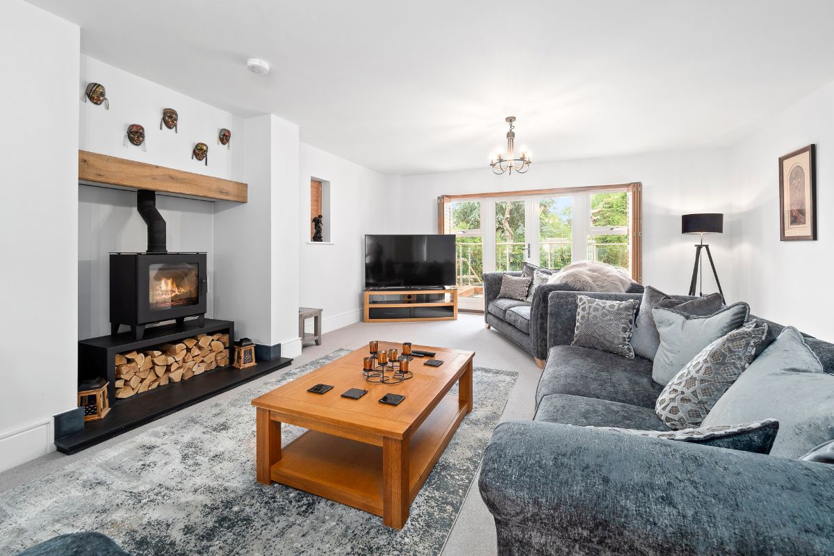 Doors to rear garden. Feature fireplace with flue, solid oak mantle, granite hearth and log burner with log box.