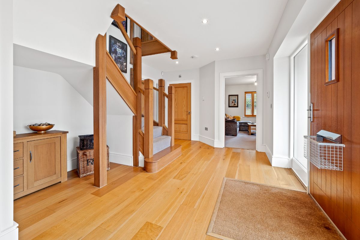 Large open hallway, Doors off to living room, dining room/study and cloakroom and to the kitchen/diner/family room. Under stairs storage cupboard housing the alarm and electrics. Stairs rising to first floor.