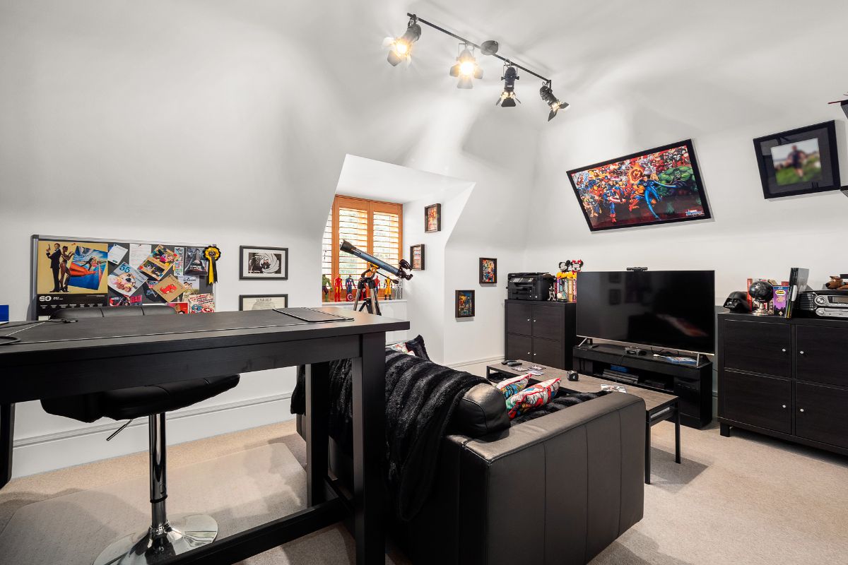 The rear garden is landscaped and has gated access into the garden from the driveway. Mostly laid to lawn with herbaceous shrubs and borders. Children's play area which is fenced in and closed off from the remainder of the garden. Space for shed to the side of the garage. Access into the office over the garage and into the gym.