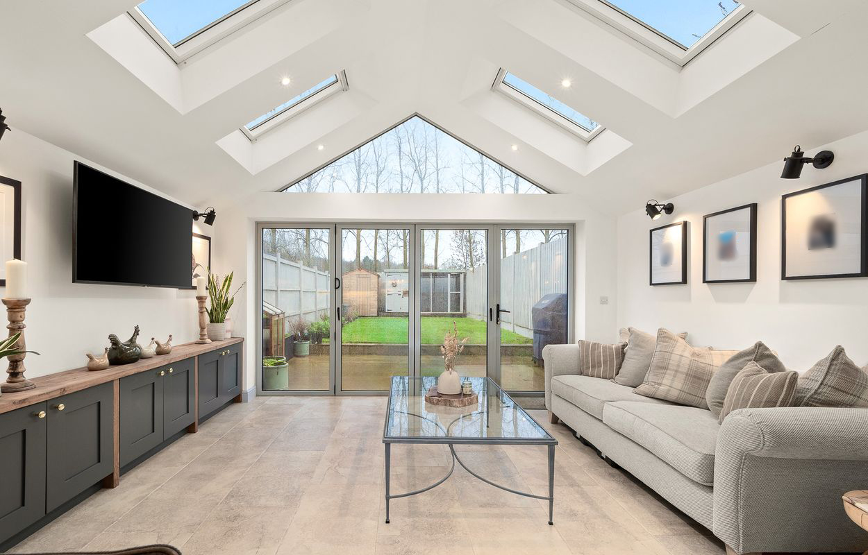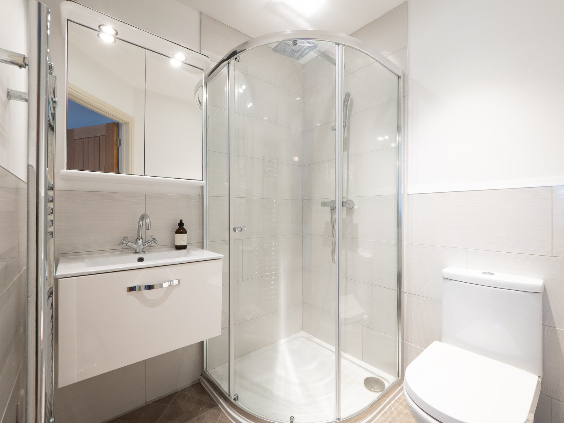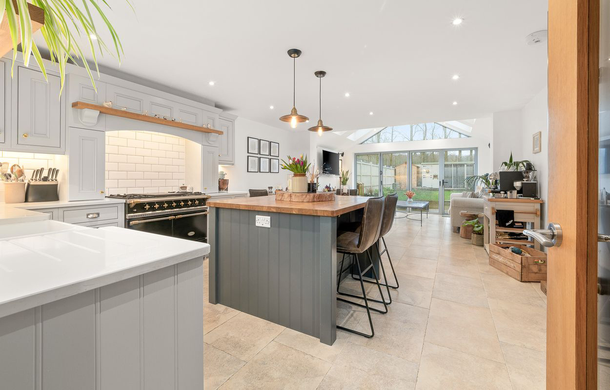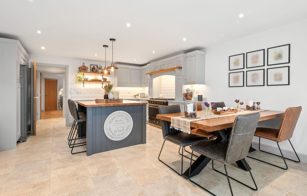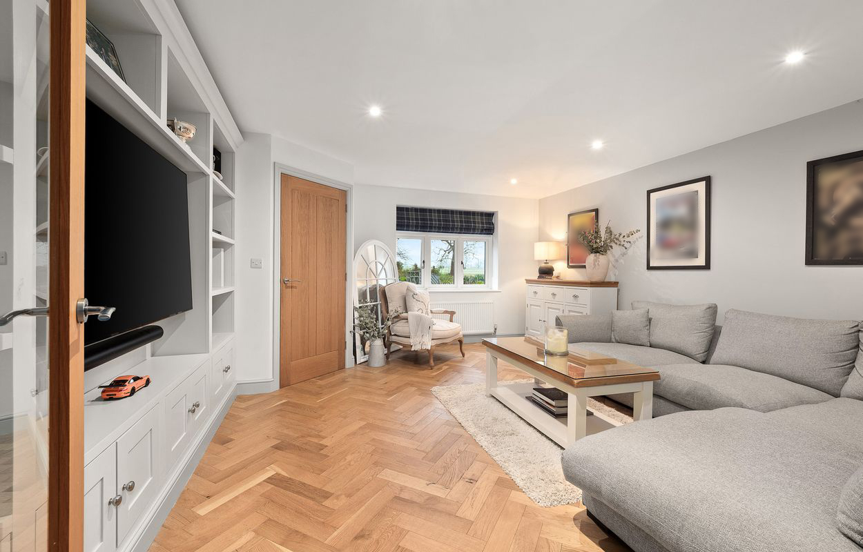 Upon entering, you are greeted by a spacious hallway that leads to a bright and airy living room complete with handy hidden storage, perfect for relaxing evenings or entertaining. The downstairs flows seamlessly through to the bright contemporary open plan kitchen complete with cosy water powered under floor heating and equipped with sleek cabinetry, double Lacanche range cooker, boiling hot tap, ample Quartz worktop space and convenient breakfast bar. The stunning kitchen flows effortlessly into the dining/snug area (also benefiting from water powered under floor heating), bathed in natural light from Velux windows and bi‑fold doors that open onto the generously sized garden, where uninterrupted field views create a truly idyllic backdrop. Completing the downstairs is a hidden utility room housing the white goods including generous storage space, and opposite a handy WC nestles under the stairs.