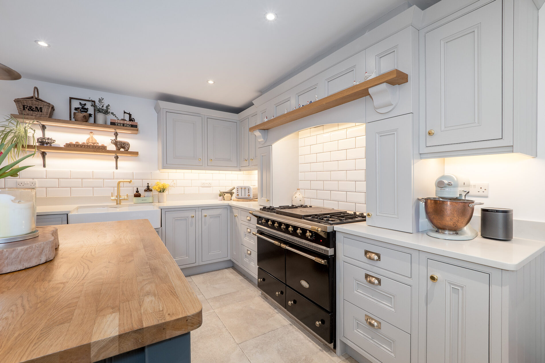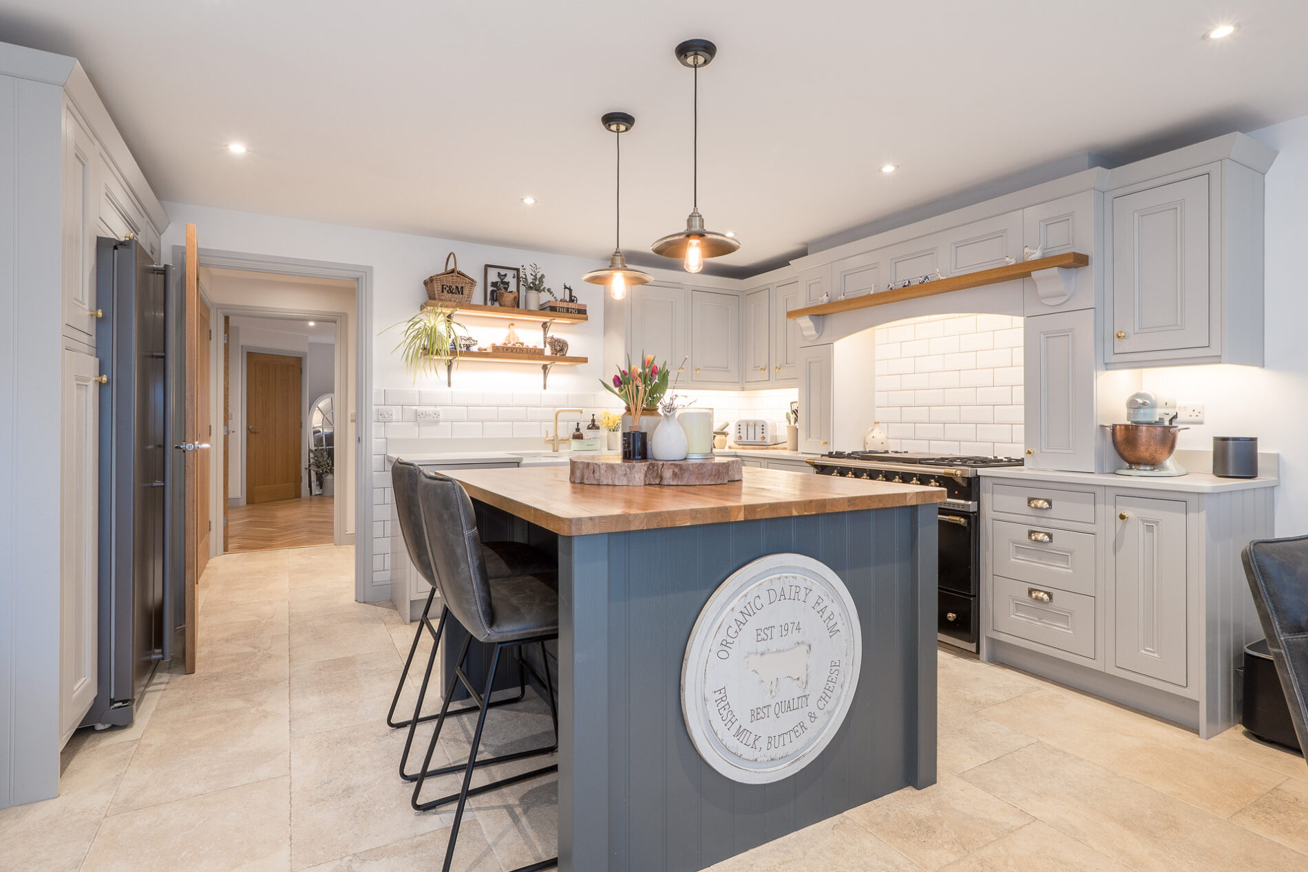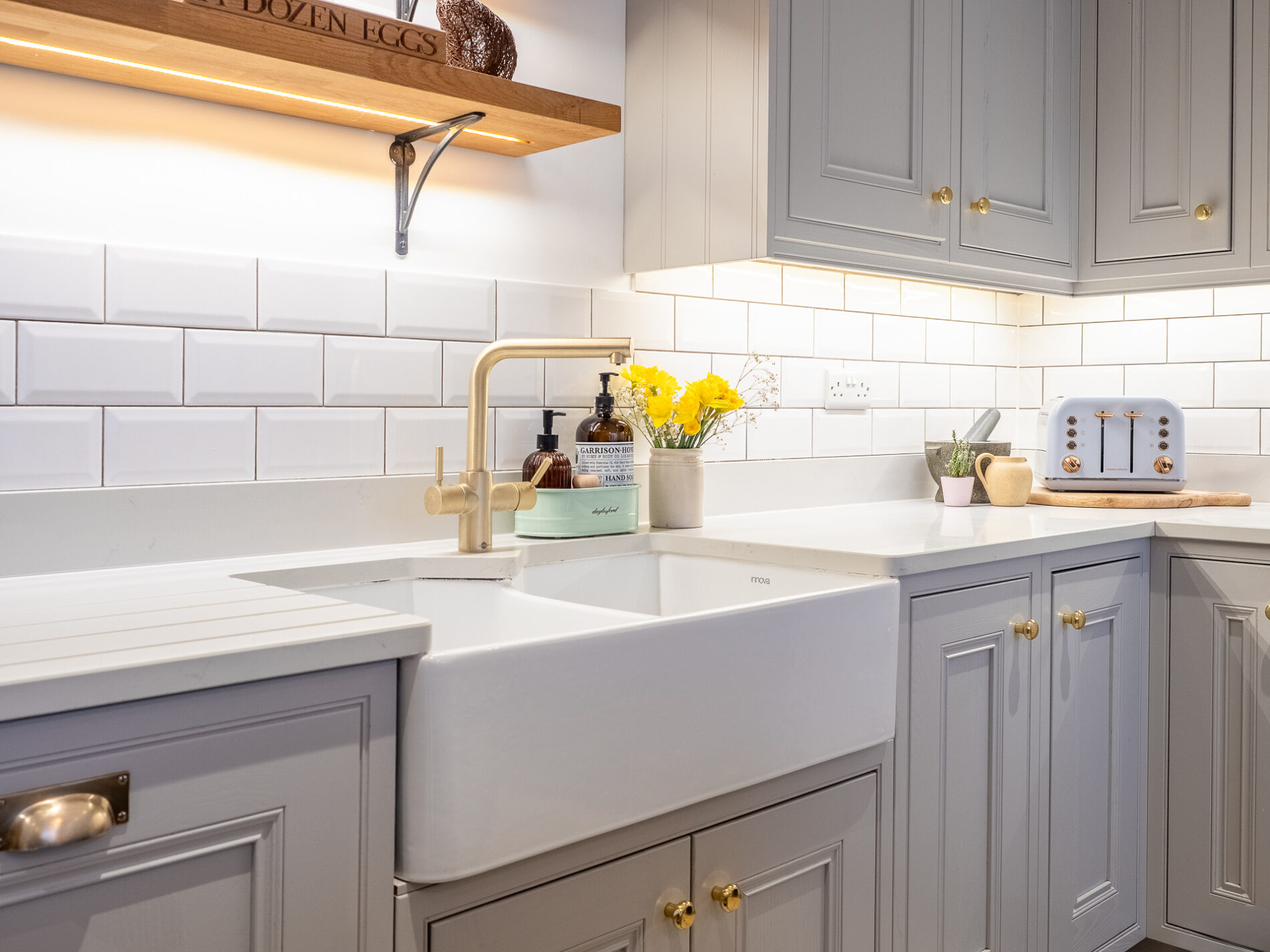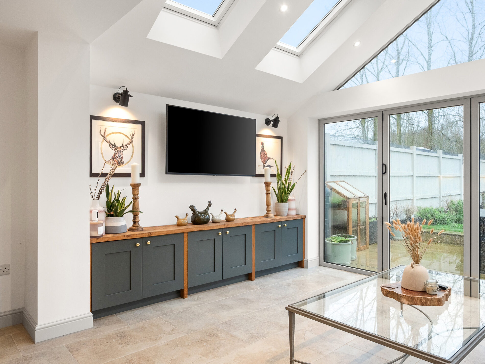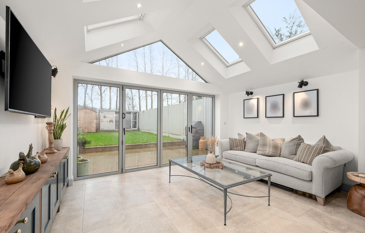 Upon entering, you are greeted by a spacious hallway that leads to a bright and airy living room complete with handy hidden storage, perfect for relaxing evenings or entertaining. The downstairs flows seamlessly through to the bright contemporary open plan kitchen complete with cosy water powered under floor heating and equipped with sleek cabinetry, double Lacanche range cooker, boiling hot tap, ample Quartz worktop space and convenient breakfast bar. The stunning kitchen flows effortlessly into the dining/snug area (also benefiting from water powered under floor heating), bathed in natural light from Velux windows and bi‑fold doors that open onto the generously sized garden, where uninterrupted field views create a truly idyllic backdrop. Completing the downstairs is a hidden utility room housing the white goods including generous storage space, and opposite a handy WC nestles under the stairs.